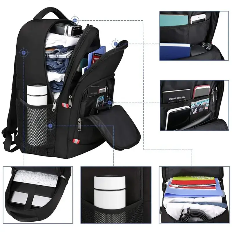 - Organisation structurée : la compartimentation interne est assurée par de multiples poches zippées de dimensions variées. Chaque objet trouve une place définie, de l’ordinateur portable aux accessoires, pour un accès rapide et une organisation efficiente de votre matériel.